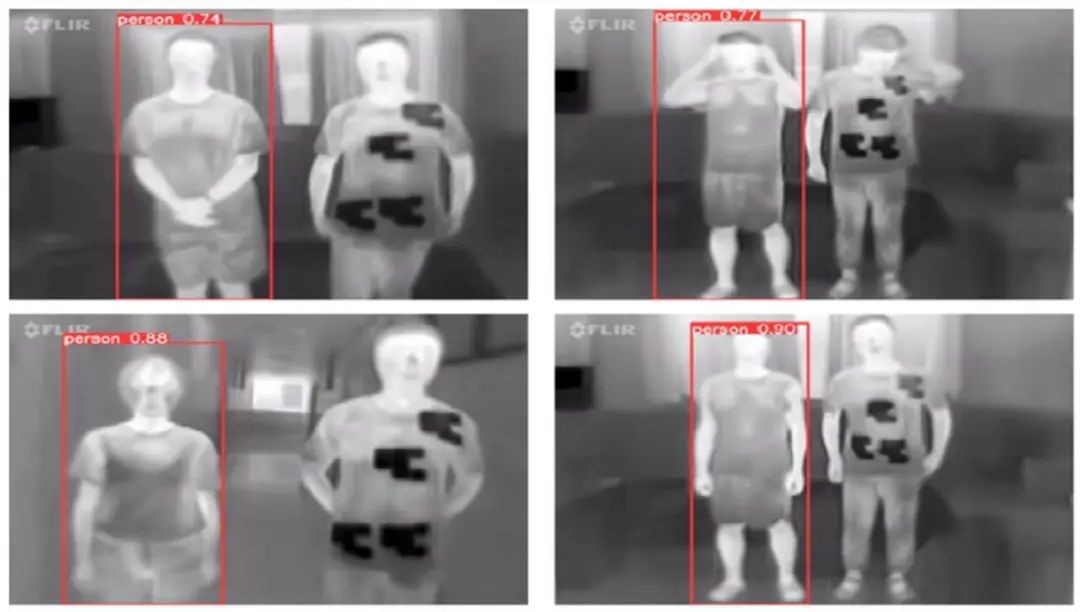 对于夜间模式,目前计算机视觉常用的是红外热成像来判断。与之对抗的办法是在“隐身衣”内装一些温控装置,有的是提高温度,有的是降低温度,使计算机难以通过热成像图案判断出人。
